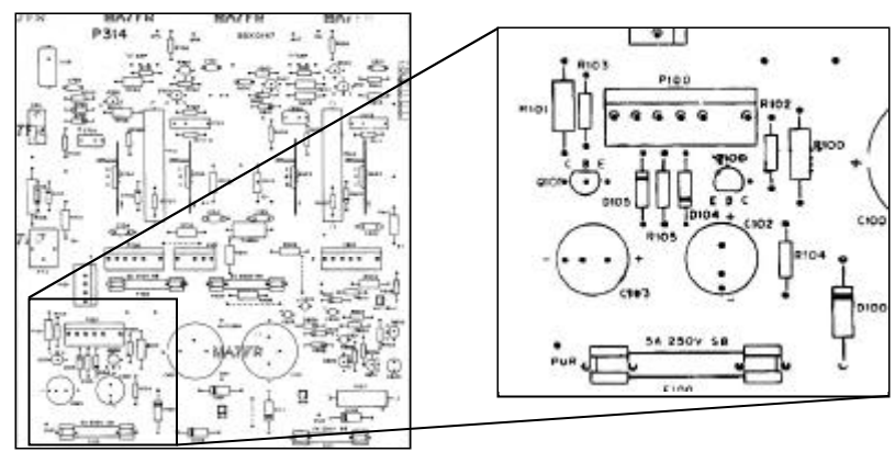 Make sure the 4 rectifier diodes (D100 - D103) are good and that the big filter caps (C100 & C101) are still good Replace any blown fuses.